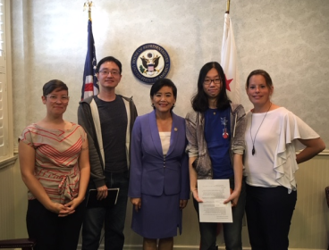 UAW Local 2865 and UAW 5810 union members with Congresswoman Judy Chu discussing her Dear Colleague Letter in support of Chinese international students at her office in Pasadena, 2018.